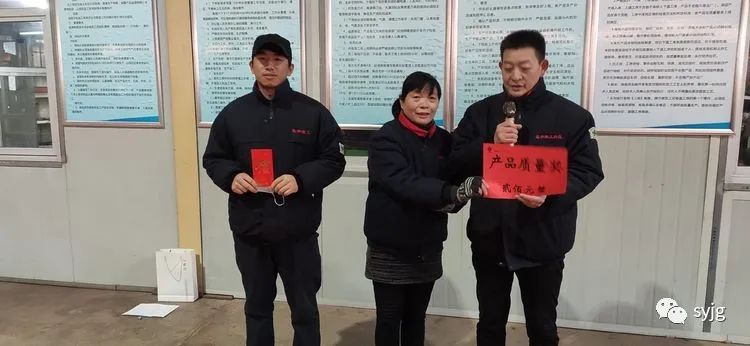 隨后,王副總公布了獲得產(chǎn)品質(zhì)量獎(jiǎng)的獲獎(jiǎng)名單:孫文孝,趙勇,范慶新,李長環(huán),孫濤,劉淵,張進(jìn),徐波,陳士柯,朱濤,魯克峰,郭馨濤,陳騰飛,趙宗萬,陳新躍,陳維貴,張玉忠,蔣學(xué)良,梁立云,王西平,范文濤,郝尚強(qiáng),李長禮,陳威傳,楊秀紅,王現(xiàn)軍,陳召明,王廣泛,張金廣,陳長靜,王晨,李煥君,萬文軒,共34人,每人獎(jiǎng)勵(lì)200元現(xiàn)金。部分奮斗在夜班崗位上的員工未能參加領(lǐng)獎(jiǎng)儀式,向他們表示辛苦了!