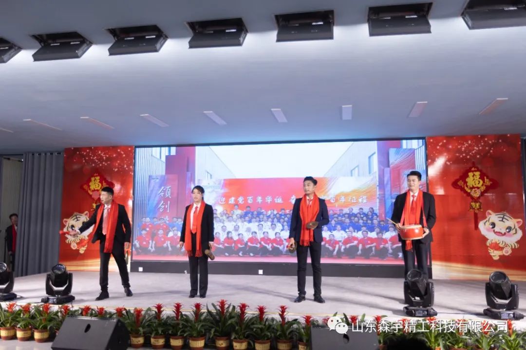 聯歡會開始前舉行了森宇精工年度表彰大會,大會由黨支部書記、副董事長梁娜主持,總經理李大亮宣讀有關表彰決定,并隆重舉行了頒獎儀式,最后由董事長王樹森做了2021年度總結工作報告和2022年度的工作安排、目標計劃和戰(zhàn)略布暑。